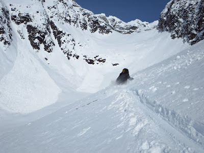 At one point after they had dropped in above us yet again their lead guide Ken stopped by to offer his apologies. No worries, we were cool. And also to offer a "pop". A what? We were dumbfounded, not sure that we understood. But yup, that's what he meant. Free lift! We took full advantage and 10 minutes later were standing on a ridge top above a run that would have taken us several ours to reach if we even could have made it there at all. In the end the run was merely okay but the story was priceless!